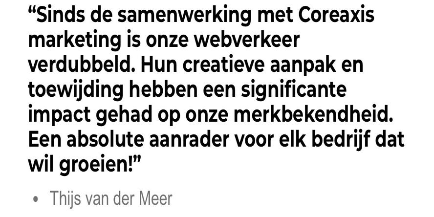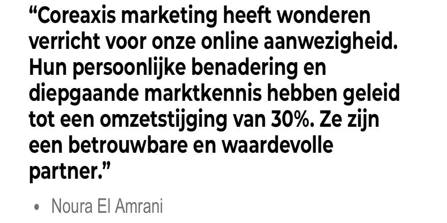 Bij Coreaxis marketing geloven we dat effectieve marketing begint met het begrijpen van jouw bedrijf en doelgroep. We combineren strategie, creativiteit en technologie om op maat gemaakte marketingoplossingen te bieden die jouw bedrijf naar een hoger niveau tillen. Ons team van experts staat klaar om jouw bedrijf te laten groeien en succesvol te maken.